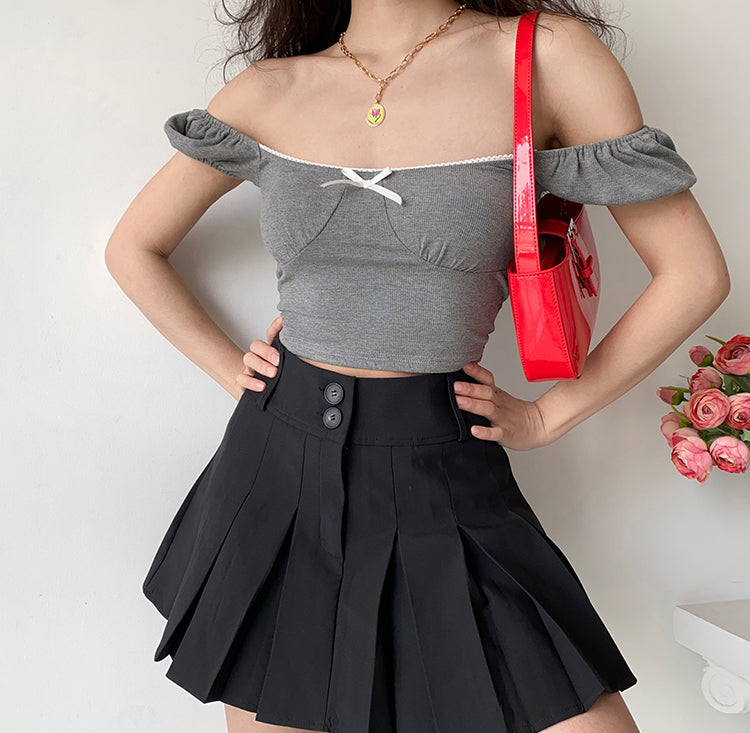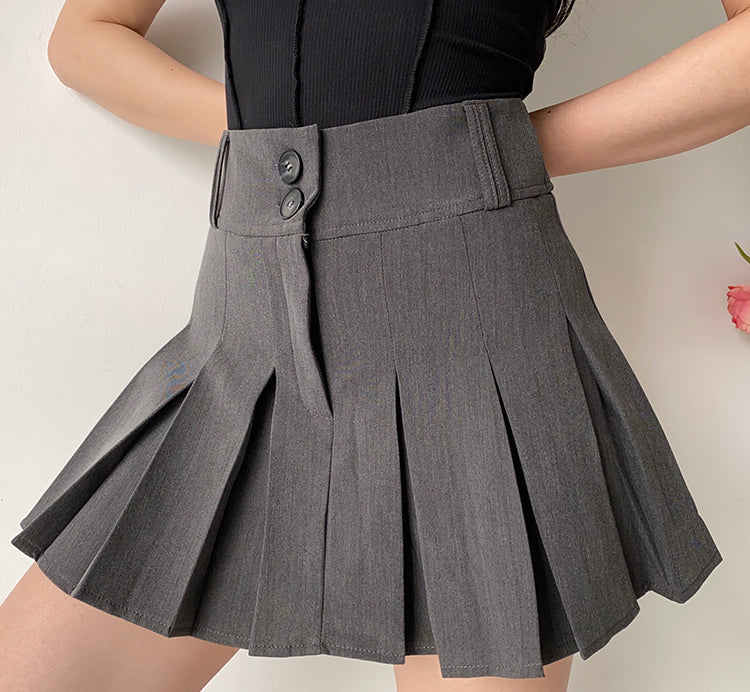 Our fave pleated tennis skirt look with a wide belted waist band and a dual button design. Built-in safety shorts. Available in Grey and Black.