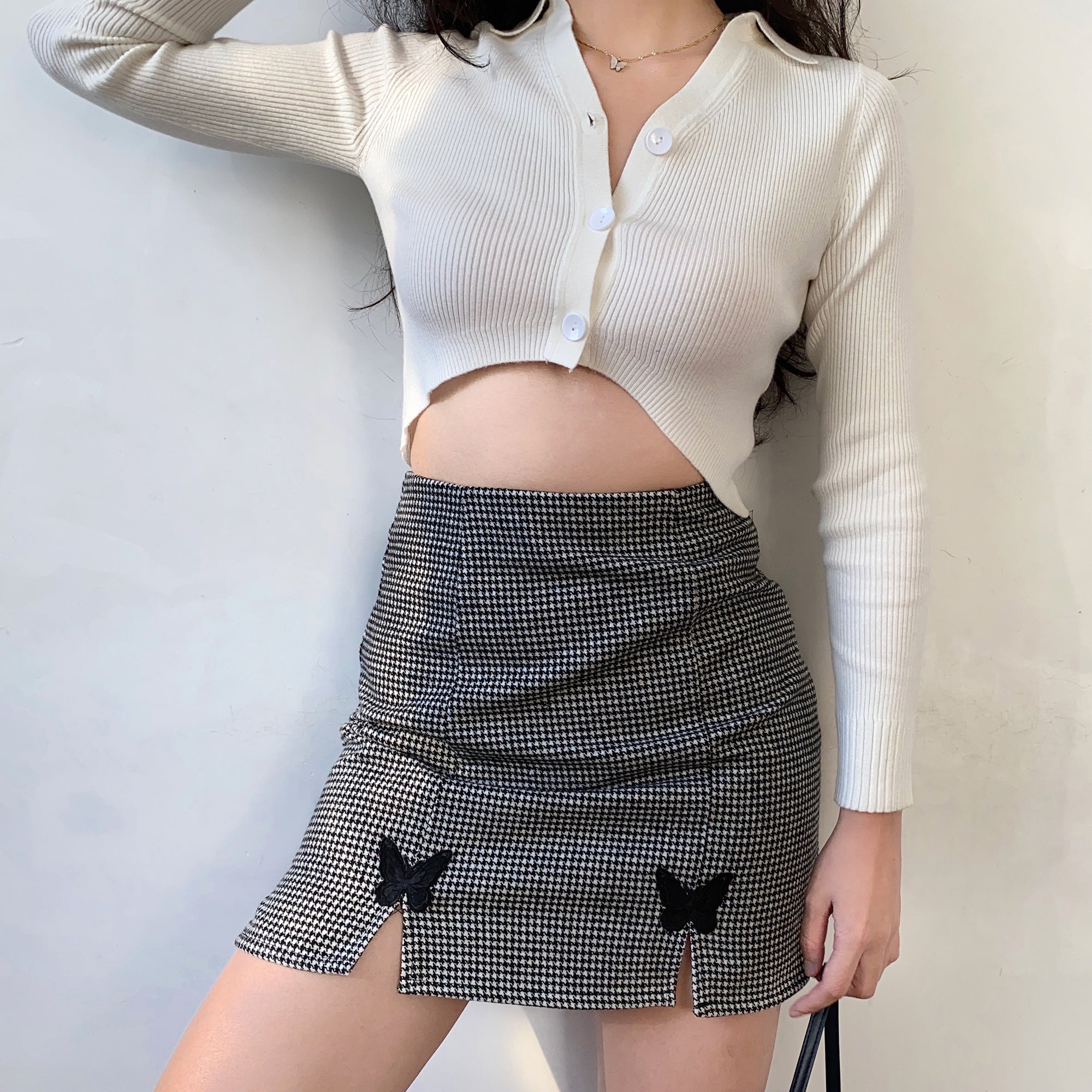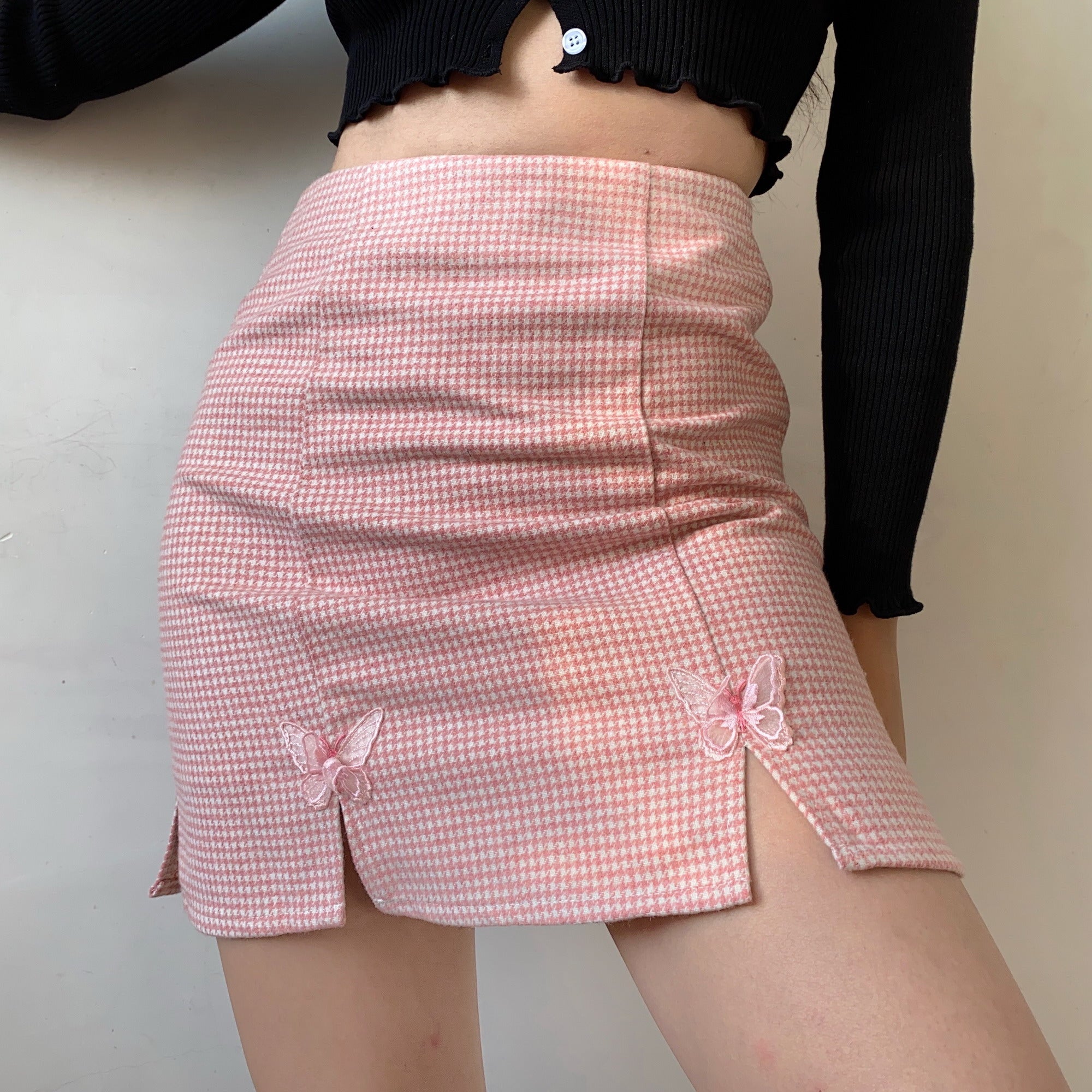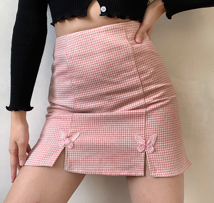 Let's swing back to the 90s in this baby! Our Butterfly Houndstooth Split Skirt features a monochrome black and white houndstooth grid with black butterfly silhouettes at the split. High-waisted. super flattering.