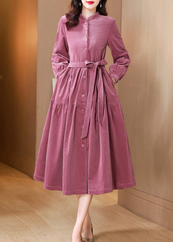 French Pink Stand Collar Tie Waist Patchwork Corduroy Dresses Fall Fabric: Corduroy Size & Fit: Fit: This garment fits true to size. Length: Size M measures 47.19"from shoulder to hem Bust: Great for any cup size. Waist: Loose Fit. Comfortable room throughout midsection. Hip: Loose Fit - room for hips. Hand Wash Cold.