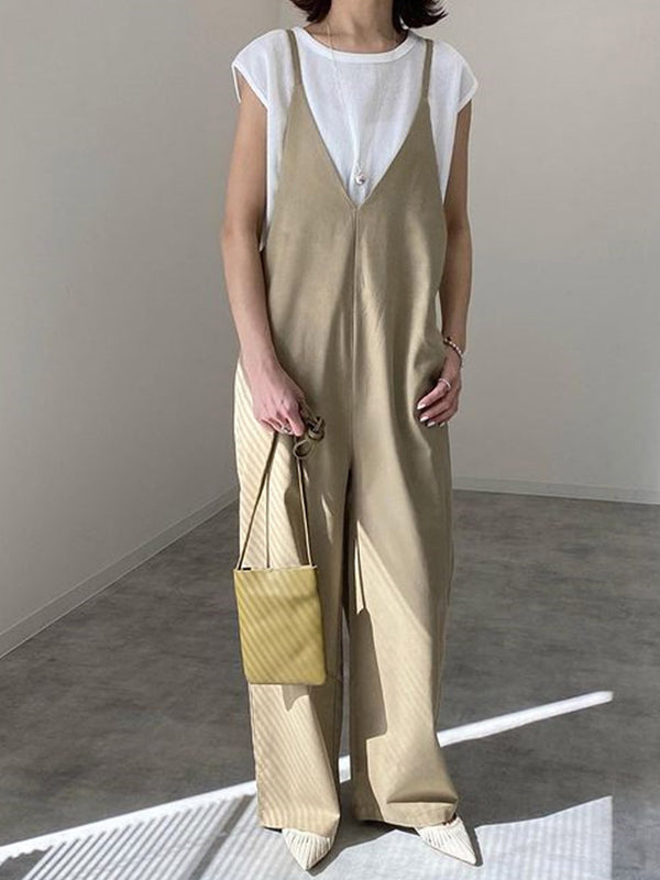 Japanese Loose Solid Color V-Neck Casual Jumpsuits