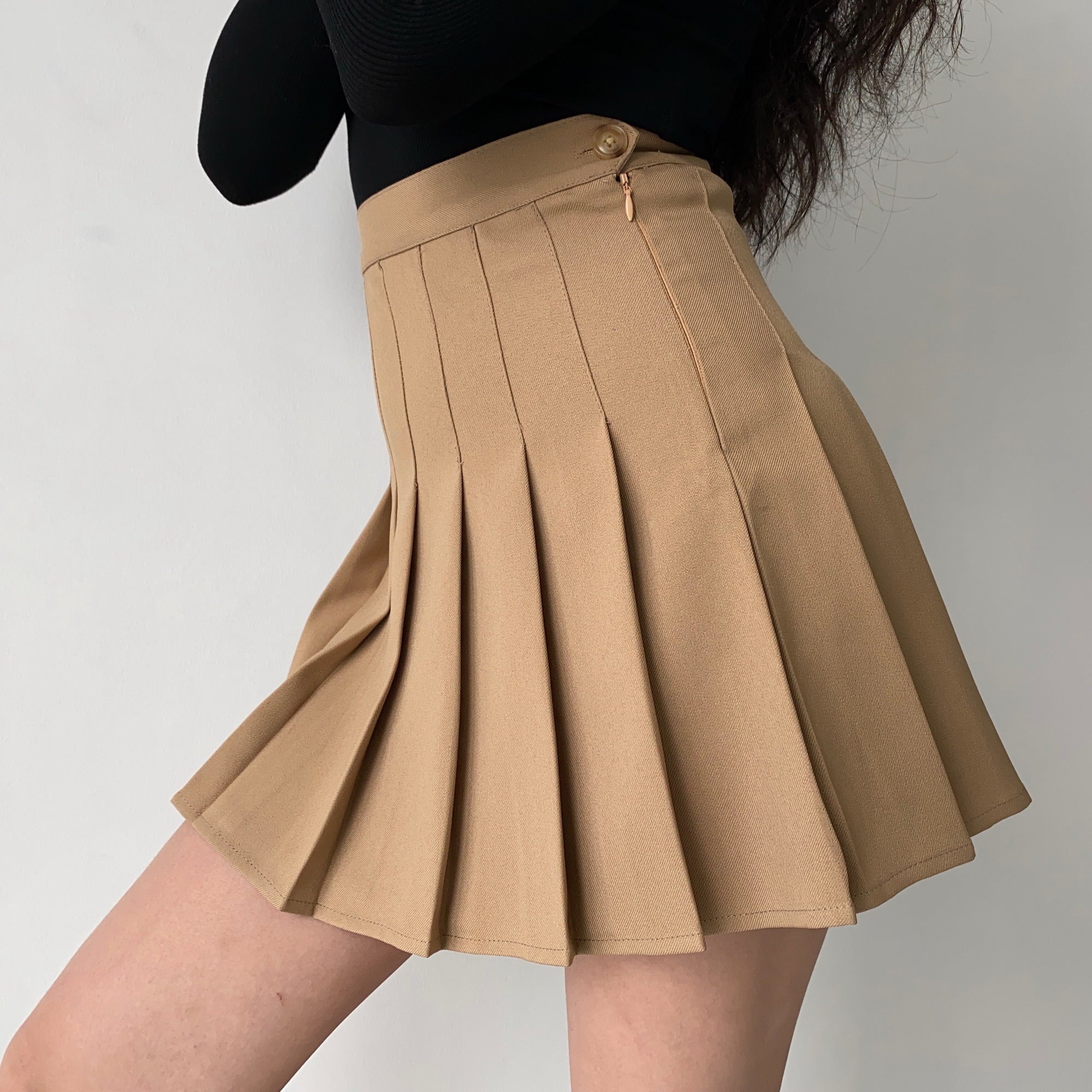 The skirt for all seasons. We are obsessed with our tennis skirts so we brought a khaki colour to our collection. Preppy and cute paired with black boots or white sneakers.