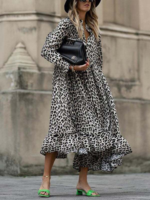 Leopard Print Long Sleeve V-Neck Loose Midi Dress