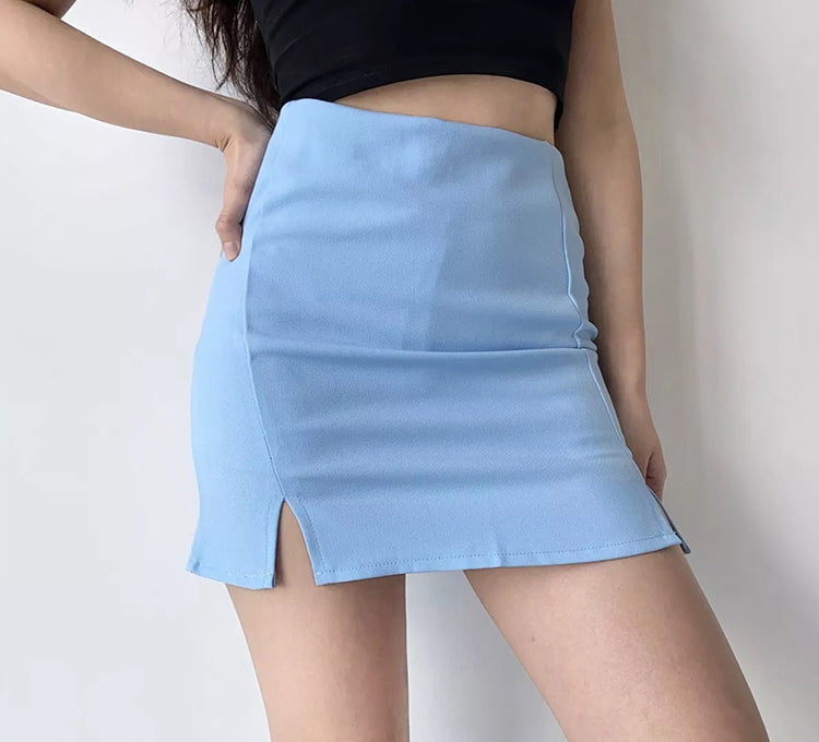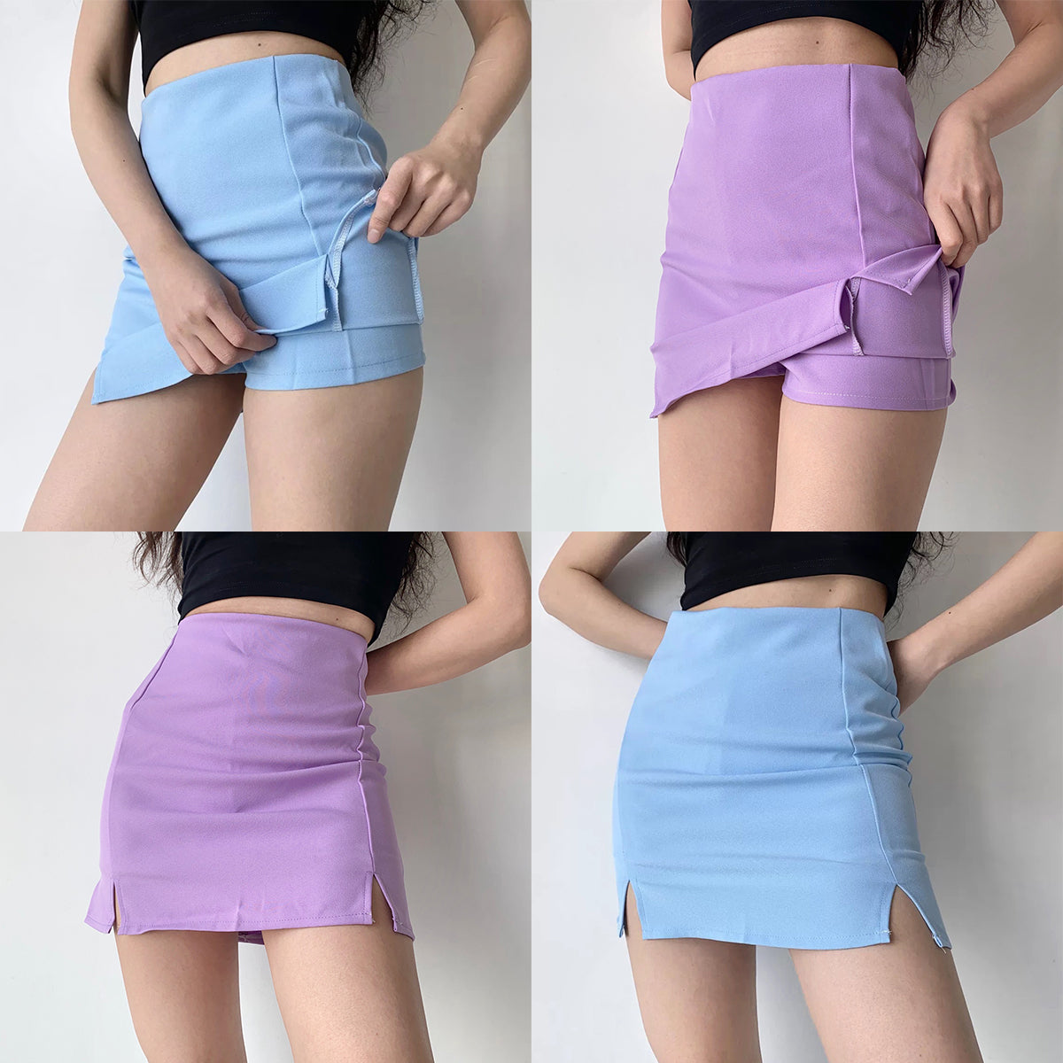 A pop of colour your wardrobe needs... This number features a double split design with built-in safety shorts. Available in Baby Blue and Purple.
