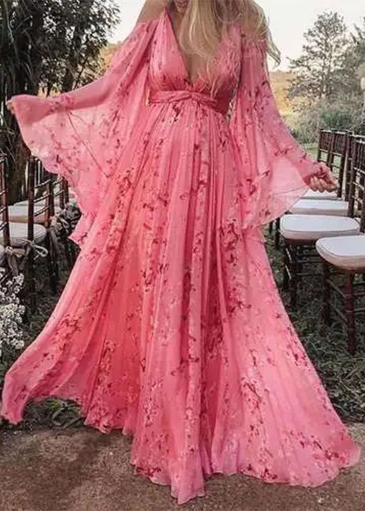 Loose Pink V Neck Wrinkled Print Chiffon Maxi Dresses Batwing Sleeve Fabric: Chiffon Size & Fit: Fit: This garment fits true to size. Length: Size L measures 53.04"from shoulder to hem Bust: Great for any cup size. Waist: Loose Fit. Comfortable room throughout midsection. Hip: Loose Fit - room for hips. Hand Wash Cold.