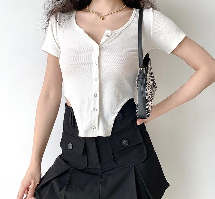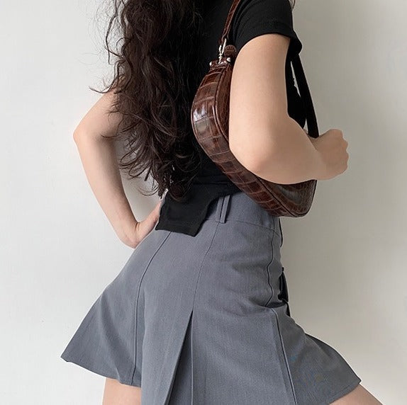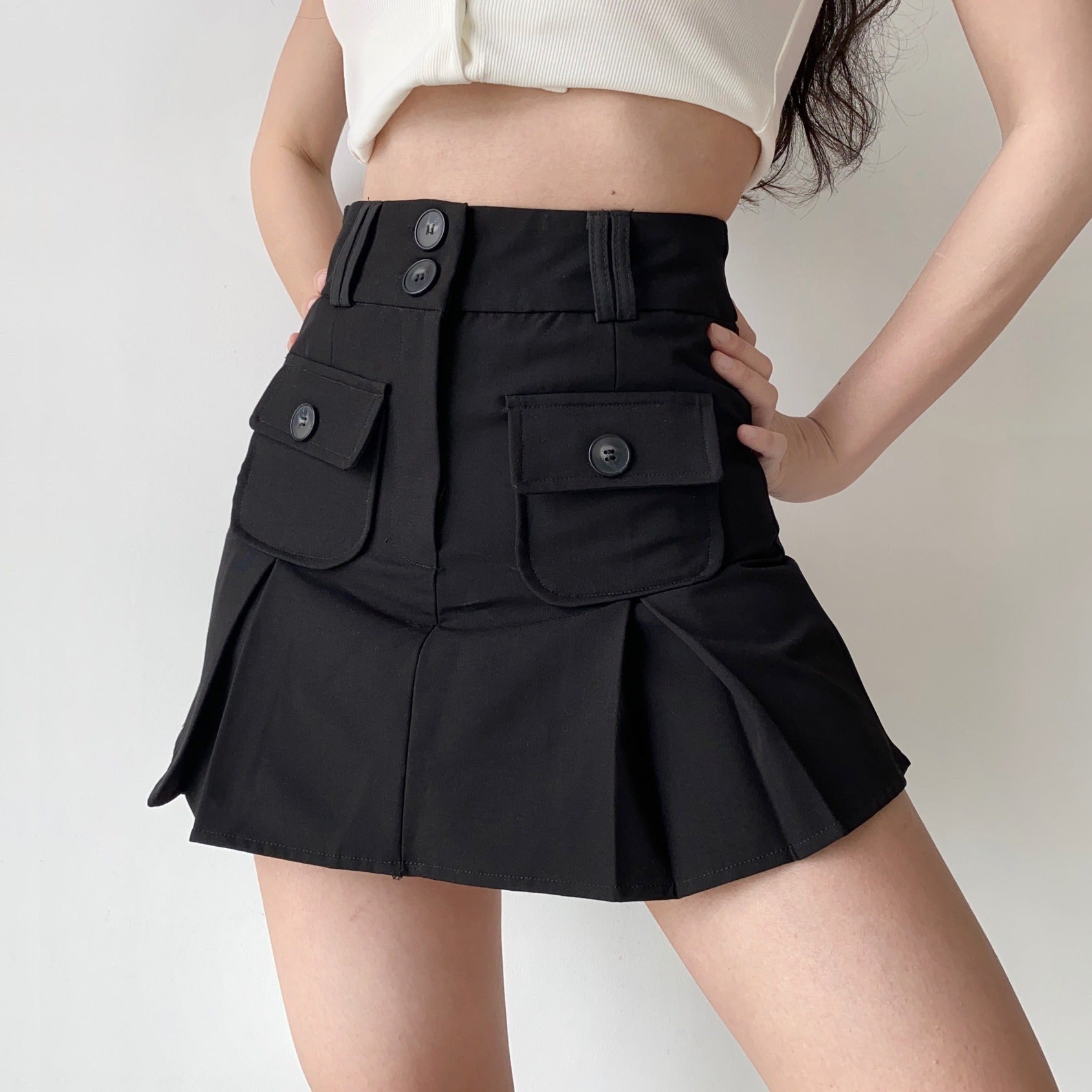 Inspired by Japanese retro school girl uniform. This number features a wide belted waist band with dual tortoiseshell buttons. Front pocket design with bottom pleats. Built-in safety shorts. fave pleated tennis skirt look with a wide belted waist band and a dual button design. Built-in safety shorts. skirt-short hybrid.