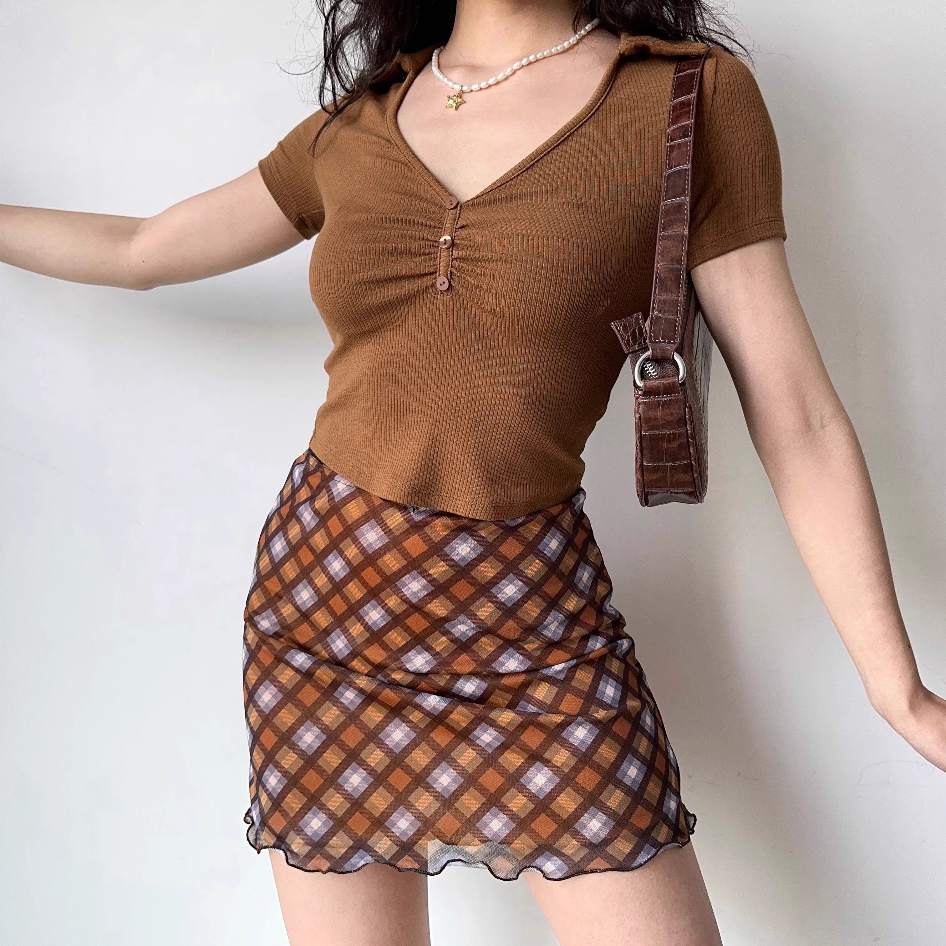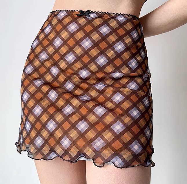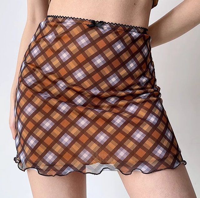 Timeless retro plaid skirt. High-waisted lined with black anglaise lace and a dainty centre-piece ribbon bow. Shirred bottom hem.