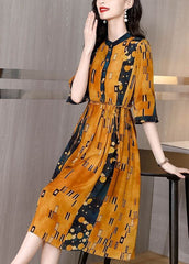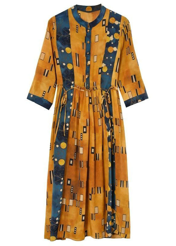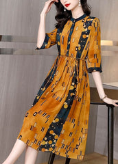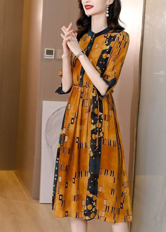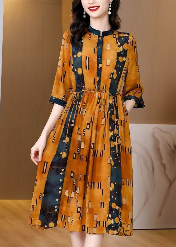 Slim Fit Yellow Stand Collar Print Silk Cinched Dress Half Sleeve Fabric: Silk Blended Size & Fit: Fit: This garment fits true to size. Length: Size L measures 44.46"from shoulder to hem Bust: Great for any cup size. Waist: Loose Fit. Comfortable room throughout midsection. Hip: Loose Fit - room for hips. Hand Wash Cold.