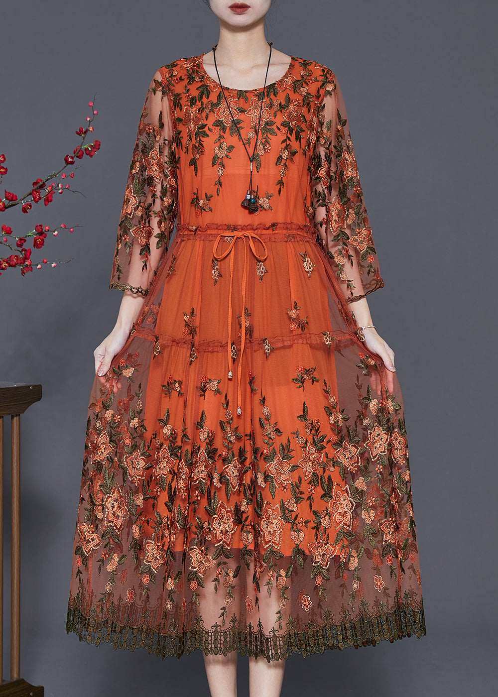 Stylish Orange Embroidered Drawstring Tulle Dress Summer Fabric: Lace Size & Fit: Fit: This garment fits true to size. Length: Size M measures 44.85"from shoulder to hem Bust: Great for any cup size. Waist: Loose Fit. Comfortable room throughout midsection. Hip: Loose Fit - room for hips. Hand Wash Cold.