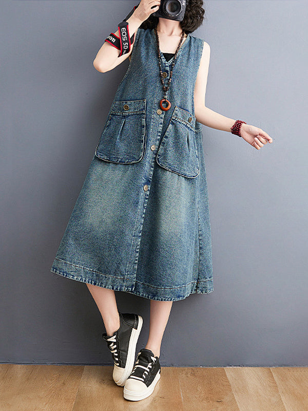 Vintage V-Neck Sleeveless Denim Vest Dress
