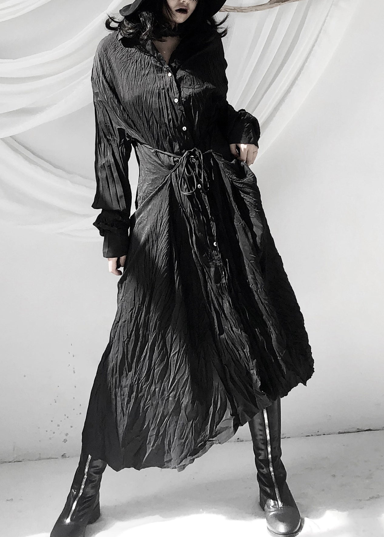Increase quantity for Women Black Wrinkled Button Tie Waist Maxi Shirts Dresses Fall